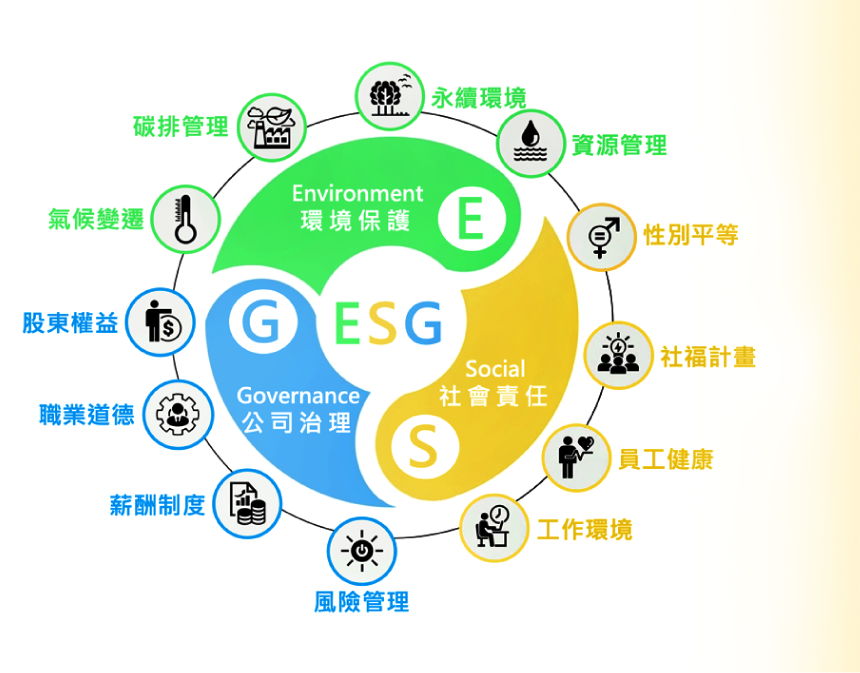 ESG是企業在 環境、社會責任與公司治理 三個層面所需承擔的責任與目標。企業不僅追求財務成長,更應在 減少環境衝擊、促進社會福祉、維護員工福利、強化透明與有效治理中扮演重要角色。